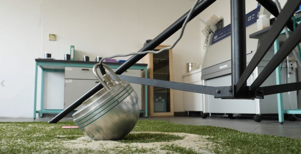 Shock absorption Derksen explains: ‘We mainly use the plates as fall damping under artificial grass pitches and playground equipment.’ Good damping of the substrate helps to prevent serious (head) injury in the event of a fall. With the head injury criterion or HIC test, based on the standard NEN-EN 1177, the degree of damping is established.